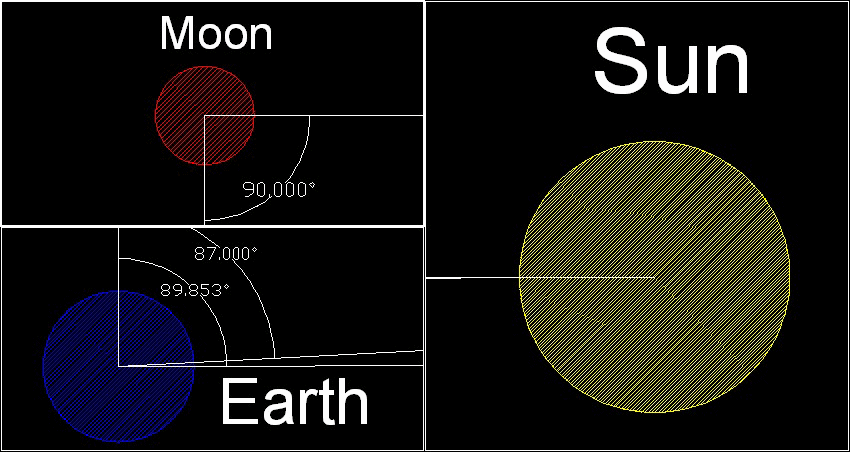 次の図は、月-地球の線からの角度が87度である地球の中心からどのようにして線が引けるかを示す。