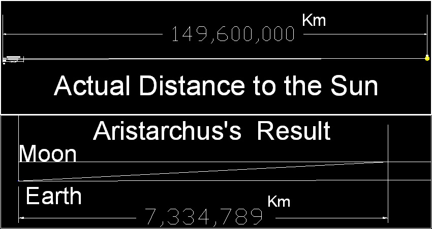 下図に彼が太陽までの距離を地球と月の間の距離の何倍になるかを測るために用いたモデルを示す。