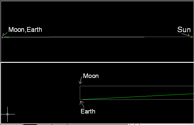 このモデルでは、月と太陽がX-軸上に来るようにし、地球が月-地球の距離の分だけY-軸で下がるように設定した。